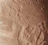 Miranda's surface is all mixed up with heavily cratered terrain intermixed with weird grooves, valleys and cliffs (one over 5 kilometers high; left).