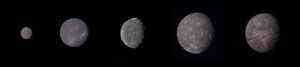Distance Radius Mass Satellite (000 km) (km) (kg) Discoverer Date --------- -------- ------ ------- ---------- ----- Cordelia 50 13 ? Voyager 2 1986 Ophelia 54 16 ? Voyager 2 1986 Bianca 59 22 ? Voyager 2 1986 Cressida 62 33 ? Voyager 2 1986 Desdemona 63 29 ? Voyager 2 1986 Juliet 64 42 ? Voyager 2 1986 Portia 66 55 ? Voyager 2 1986 Rosalind 70 27 ? Voyager 2 1986 2003U2 75 6 ? Showalter 2003 Belinda 75 34 ? Voyager 2 1986 1986U10 76 40 ? Voyager 2 1986 Puck 86 77 ? Voyager 2 1985 2003U1 98 8 ? Showalter 2003 Miranda 130 236 6.30e19 Kuiper 1948 Ariel 191 579 1.27e21 Lassell 1851 Umbriel 266 585 1.27e21 Lassell 1851 Titania 436 789 3.49e21 Herschel 1787 Oberon 583 761 3.03e21 Herschel 1787 2001U3 4281 6 ? Sheppard 2003 Caliban 7169 40 ? Gladman 1997 Stephano 7948 15 ? Gladman 1999 Trinculo 8578 5 Sycorax 12213 80 ? Nicholson 1997 2003U3 14689 6 ? Sheppard 2003 Prospero 16568 20 ? Holman 1999 Setebos 17681 20 ? Kavelaars 1999 2002U2 21000 6 Sheppard 2003