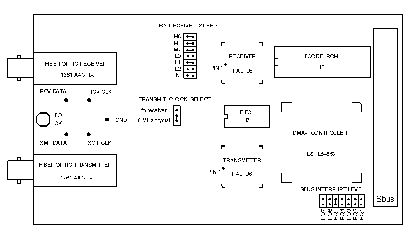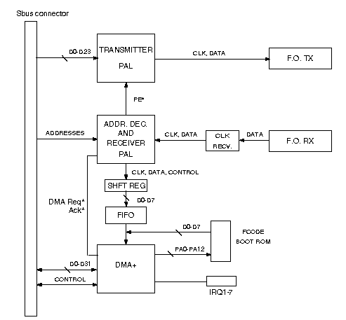 Serial data is received by the fiber optic receiver and sent to a clock recovery chip that generates a clock signal synchronized to the data using a phase locked loop amplifier. The synchronized clock and data signals (RCVCLK and RCVDATA) are buffered by the receiver PAL and sent to a serial-in parallel-out shift register that outputs data a byte at a time to a FIFO (first-in first out) memory. The shift register is cleared at the beginning of each serial word and data is sampled on the rising edge of the clock. The shift register has an internal set of latches, so the PAL generates a signal (LATCH) to latch each byte every eight bits of incoming data, after stripping away the start bit from each data word. Soon after each byte is latched into the shift register it is written to the FIFO. Once a byte is written to the FIFO the empty flat EF* of the FIFO is de-asserted, which connects to the DMA request input line of the DMA+ chip. If DMA operations have been enabled it will assert the DMA acknowledge line which is connected to the read line of the FIFO, causing a byte of data to be written on the data lines and transferred to the DMA+ chip. Once inside the DMA+ chip the data sit in an internal cache until 32 bytes have been accumulated, after which they are written to the SBus as four longwords in a single burst.