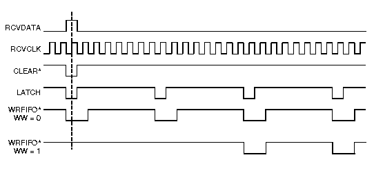 The interface receiver operates in two modes depending on whether it is processing replies to commands or image data. Replies contain 24 bits of significant data so are written as 32-bit data words over the SBus, whereas image data only contain 16 bits of data and are written as 16-bit data words. As shown in Fig. 8-3 below, reply handling is implemented by generating four WRFIFO* pulses for each data word, the first (most significant) one being a zero since it occurs right after the shift register is cleared. For image data only two WRFIFO* pulses are generated per word, on the two least significant bytes of the input data word. Switching between modes is effected by writing a 0 or 1 to the address 0x4xxx1c (PA22=PA3=PA2=1, PA23=PA4= PA1=PA0=0), where the default is WW = 0 (reply mode), as follows -
