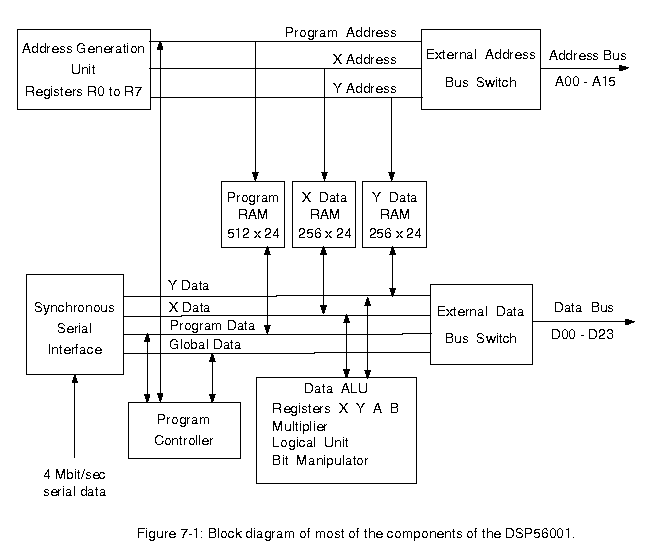 The heart of the timing board is the Motorola DSP56001, an integer digital signal processor processor with a 24-bit data word, a 16-bit address space, a fast ALU, a Reduced Instruction Set Computer architecture that executes most instructions in one clock cycle (100 nanosec in this design) and extensive on-chip peripheral support. These peripherals include separate address spaces for on-chip program and data memory, a synchronous serial interface, boot logic and a simple interface to an external data bus. A block diagram of the DSP is shown in Fig 7-1.