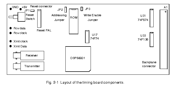 The principal components of the timing board are shown in Fig. 2-1. The connector JP1 near the reset switch allows connection of a remote switch for resetting the DSP, and should never have a jumper installed on it. Fig. 2-2 describes the meaning of jumpers JP2 and JP3, and the EEPROM memory map.