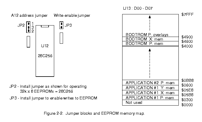 Versions 2.10 and later of the DSP software can only be executed from 32k x 8 EEPROMs (28C256). 8k x 8 UV erasable ROMs will still work with these timing boards, but only with earlier revisions of the DSP software. The address selection jumper JP2 should be set as shown in Fig 2-2 for operation with 32k x 8 EEPROMs. A jumper should be installed on JP3 if the user needs to write to the EEPROM while it is installed in the timing board. Hardware protection of the EEPROM contents can be provided by not installing the write enable jumper. Software protection is provided against writing to the boot area of the EEPROM by disallowing writing above address $4000. This prevents damage to the boot program so basic DSP operation, memory management and communication functions will be operational after the DSP is rebooted even if erroneous writes to the DSP or EEPROM application program have been made.