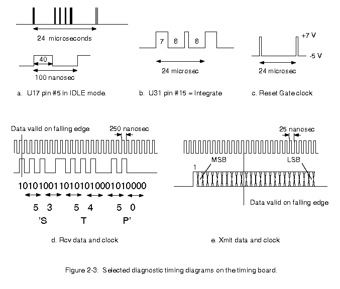 (5) Computer communication: With the timing board connected to the host computer via the optical fiber link, several commands should be issued. Examining U17 pin #5 with a scope, a STP command should stop the waveforms, an IDL command should resume them, and a RST command should produce waveforms like the power-on reset. The TDL command should be executed to verify that the serial link works in both directions. The STP command should be sent repeatedly from the host computer with a scope connected to the Rcv data and Rcv clock pins, as shown in Fig. 2-1, to obtain the waveforms shown in Fig. 2-3d.