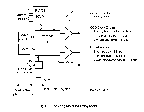 Fig. 2-4 shows a block diagram of the main components of the timing board. A boot ROM loads the DSP with its program and parameter set after power-on reset or an explicit command from the host computer, while a hardware delay circuit stops the DSP from executing commands for programmable intervals. Buffers to the backplane implement a range of programmable timing pins and receive image data from each of the analog boards. A detailed description of the operation of the timing board follows, and makes reference to the board schematic.