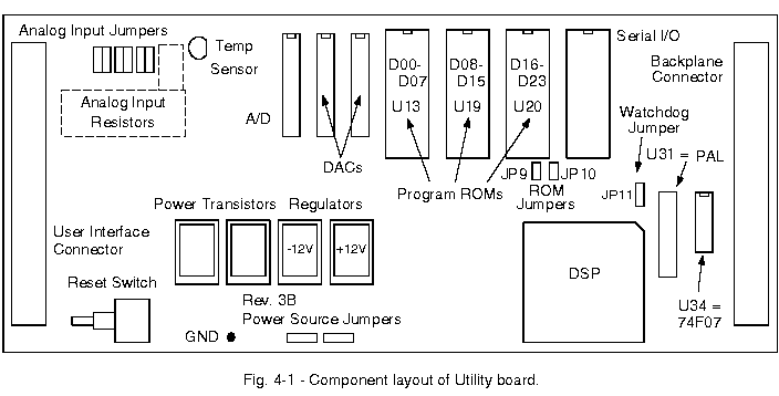 Fig. 4-1 shows the placement of the major components of the utility board. The board contains a DSP, provision for up to 32k x 24 bit external program memory, regulators for +/- 12 volt power, two high current drivers for heaters, four digital-to-analog converters (DACs), an analog-to-digital (A/D) converter with a 16-input multiplexer, 16 digital inputs and 16 digital outputs, three configurable analog input amplifiers, a