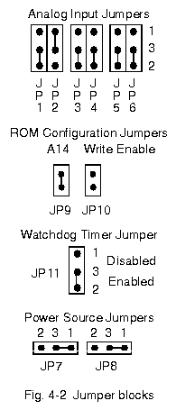 manual reset switch, and two 96-pin DIN connectors. Jumper blocks are located in four areas, and control the configuration of the analog input amplifiers, the program ROM memory, the watchdog timer, and the source of the +/- 15 volt power for the board. Fig. 4-2 gives a close-up and labeling of these jumper blocks.