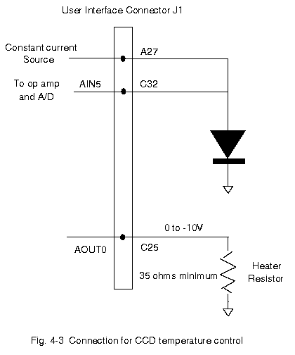 A constant current source supplying 50 microamps is provided on pin A27, and should be connected as shown in Fig. 4-3 for use with temperature sensing diodes near the CCD. Two resistors (R1 and R2) are connected in parallel to the constant current source FET Q1. These are trimmed to provide 50 microamps to within one percent so the temperature calibration will be the same for different utility boards. The CCD heater power is provided as a voltage that ranges from 0 to -10 volts rather than the conventional positive voltage in order to load the +12 and -12 supplies more equally. The CCD can be conveniently heated with a resistor mounted near it, but care should be taken to prevent the on-board power transistors Q2 or Q3 from dissipating more than 1.6 watts so they don't overheat and damage the circuit board. This can be easily implemented by installing a heater resistor of 35 ohms or larger, which will provide a maximum heater power of 2.8 watts.