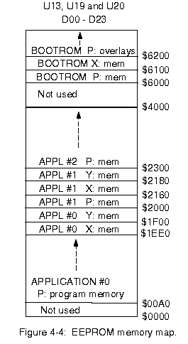 Application number zero is a special case and is designated for large application programs that cannot execute in their entirety from internal DSP P: memory space. Instructions located at EEPROM address P:$200 up to P:$1EE0) will be executed directly from EEPROM. Instructions from P:APL_ADR to P:$1FF will be read from EEPROM into DSP P: memory by the 'LDA 0' command. Its EEPROM memory map is also shown in Fig 4-4.