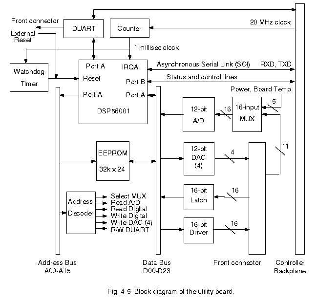 The utility board provides a miscellany of support functions that are not directly involved with the readout of the CCDs. These include exposure timing, CCD temperature control, and system voltage and temperature monitoring. Based around a Motorola DSP56001 microprocessor, the utility board can be programmed by the user to support other functions such as an additional temperature controller, dewar level and ID, shutter status, LED drivers for status indication, and switch monitoring for direct system control without a host computer . A interrupt circuit forces the DSP to update all inputs and outputs every millisecond, providing precise exposure timing, while 12-bit A/D and D/A converters offer good analog precision. Commands are received from the timing board over a fast serial link and processed as necessary. Additional serial links can be used to communicate with other devices. A block diagram of the board is shown in Fig. 4-5.